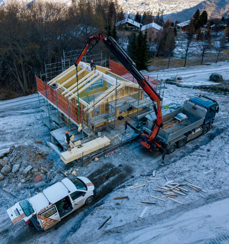 Chalet en ossature bois aux Clèves Nendaz Chalet ossature-bois au lieu dit les Clèves à Haute-Nendaz. Mandat des artisans : ossature-bois – charpente – façade – menuiserie intérieure Année de construction : 2021