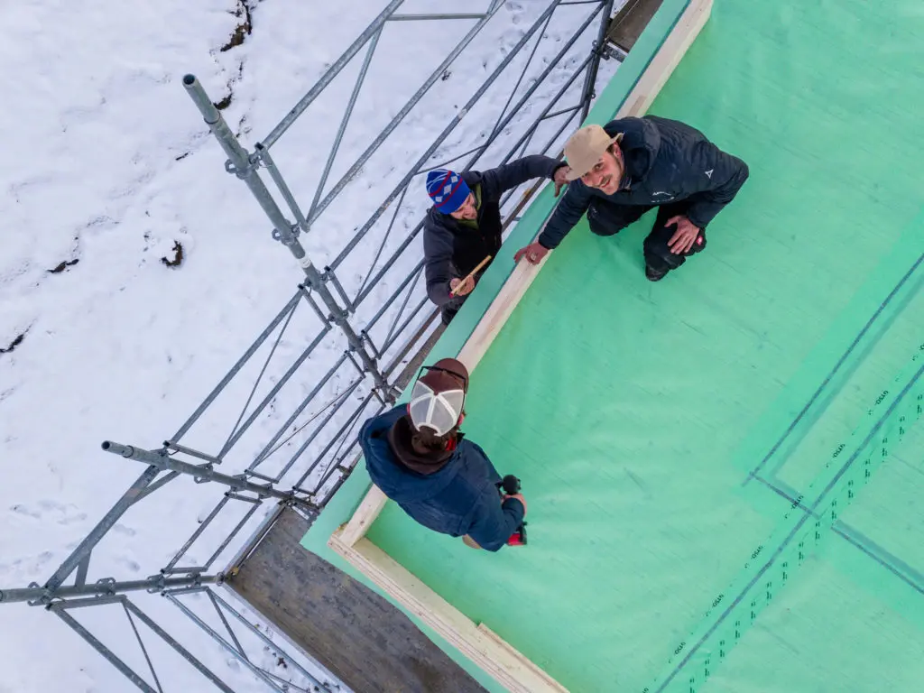 Ce montage complet d’un chalet en ossature bois aura duré à peine 4 jours de la première paroi jusqu’à l’étanchéité sur le toit. Il est l’aboutissment de l’accompagnement d’un jeune de la région dans le projet de sa nouvelle maison.
