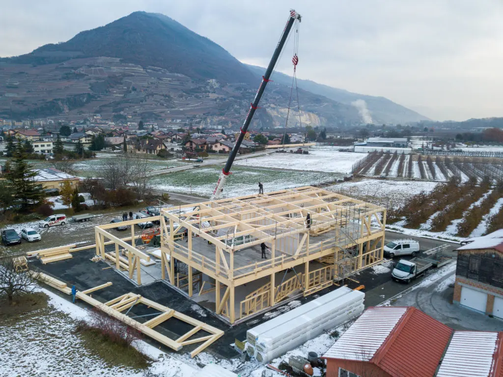 Construction de 2 halles en bois à St-Léonard par JM Etude Bois Sàrl avec une structure porteuse labellisée Suisse COBS en partenariat avec l’entreprise des Artisans Du Bois SA à Nendaz et Gabioud Fusay SA à Orsières. Il s’agit de notre premier projet qui utilise la technique des dalles mixtes bois-béton. La fine couche de béton sans fer travaille en compression tandis que les poutrelles en bois lamellé collé s’occupe de la traction : un beau mariage !